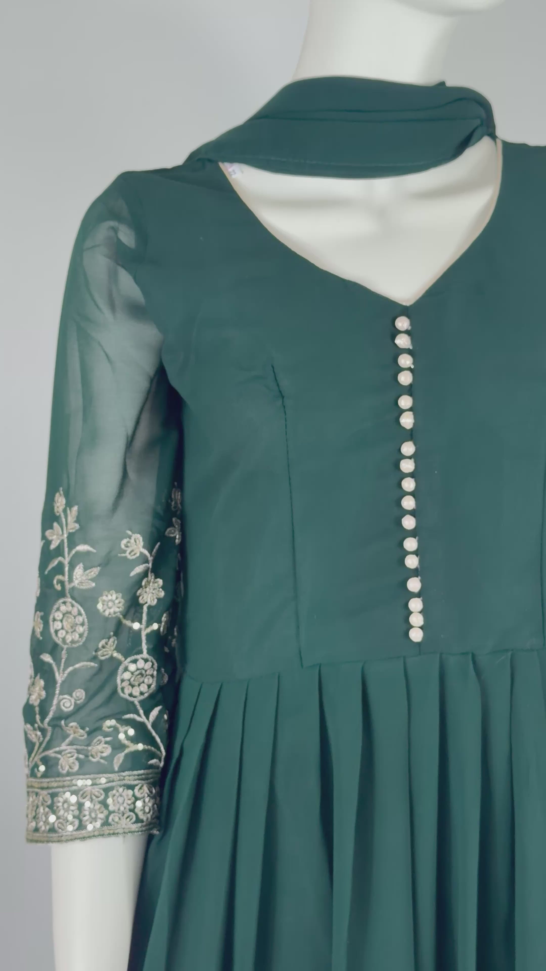 Elegant Anarkali with beautiful embroidery on sleeves and hem. Soft, flowy fabric with classy front button detailing.